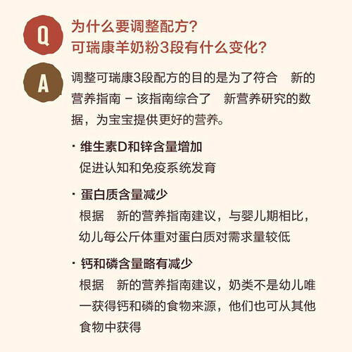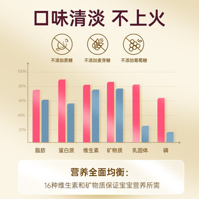 羊奶球蛋白分子量小,亲和人体易吸收,营养价值更高。不额外添加蔗糖、葡萄糖和麦芽糖,口味清淡,保护乳牙。