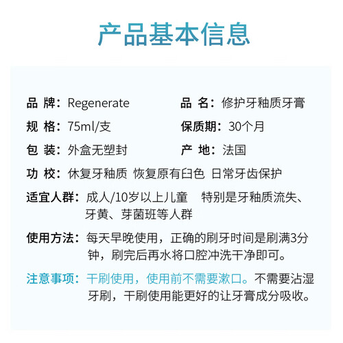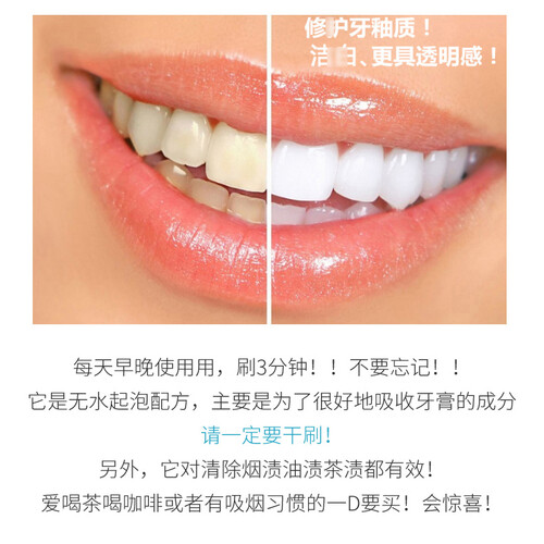 不添加水,含有高纯度的有校修复成分,能保护牙釉质,去除牙烟渍、茶渍等,减少其他牙齿问题的发生。