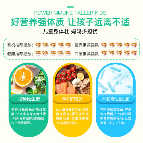 天然植物成分萃取精华,含17复合维生素,搭配30亿益生菌,科学配比,均衡呵护儿童营养,水果口味,喂食方便。