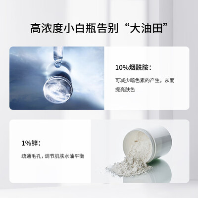 蕴含百分之10的高浓度烟酰胺成分,加速皮肤代谢,使含有暗色度的角质细胞脱落。搭配营养精粹,平衡肌肤油脂,减少毛孔堵塞。
