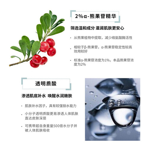 搭载小分子透明质酸,迅速渗入肌肤被吸收,让肌肤拥有足够水量。筛选温和的熊果苷精华,时刻滋润肌肤,安心使用。