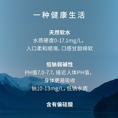 源于新西兰净土水源,经过火山岩层天然过滤,水质接近人体PH值,天然软水更健康。口感绵软柔和,富含丰富矿物质。