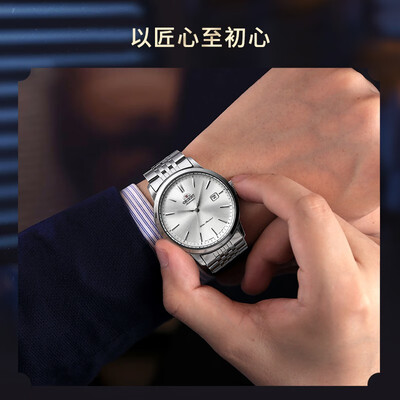 大开面的表盘设计,简约大气,配以银色的基调,愈发显得低调典雅。自动的机械机芯,走时准确无误,约会工作不迟到。