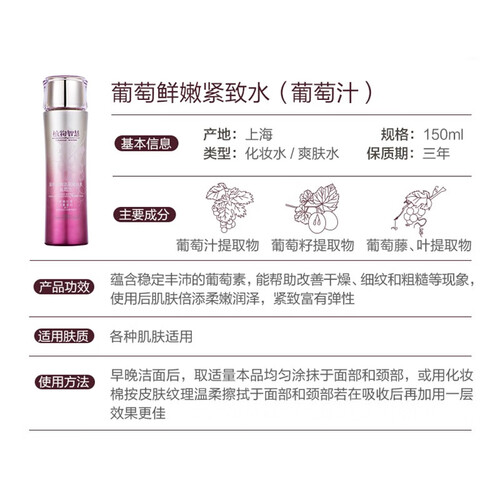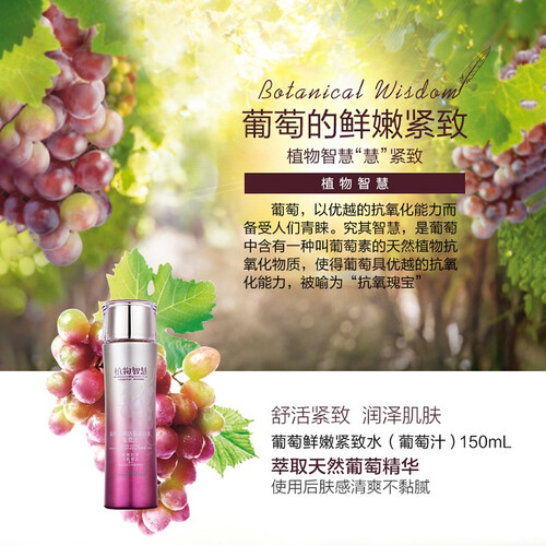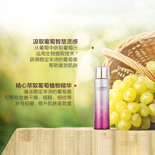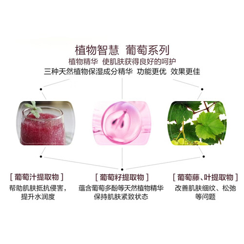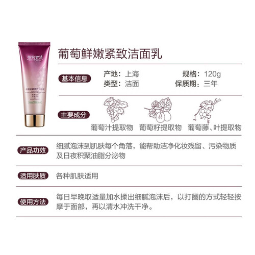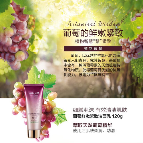爽肤水添加葡萄汁提取物,能帮助肌肤提升含水量,告别干燥,水润肌肤。洁面乳泡沫丰富,轻松进入毛孔内部,将残留彩妆全部洗去。