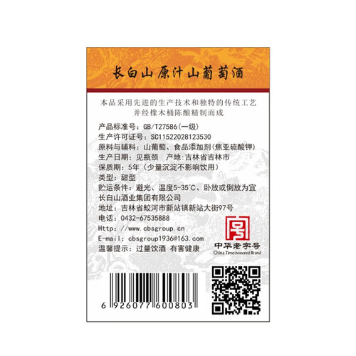 长白山 原汁山葡萄酒红酒