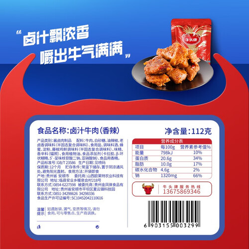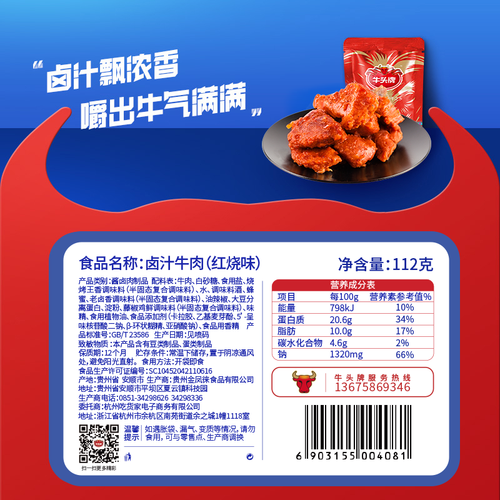 选用云贵高原牧养的黄牛,选取精品后腿腱子肉为原料,传统工艺结合现代风味,制成五香浓郁的卤牛肉,鲜香有嚼劲。