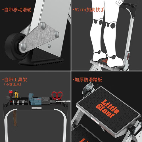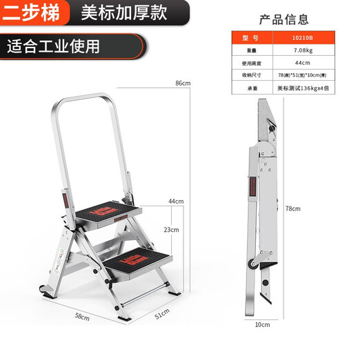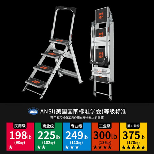 采用加厚梯身设计,质地更加坚固,拥有出色的承重性能。拥有加宽的防滑工作踏板,踩踏起来不会有凹陷感,上梯更稳健。
