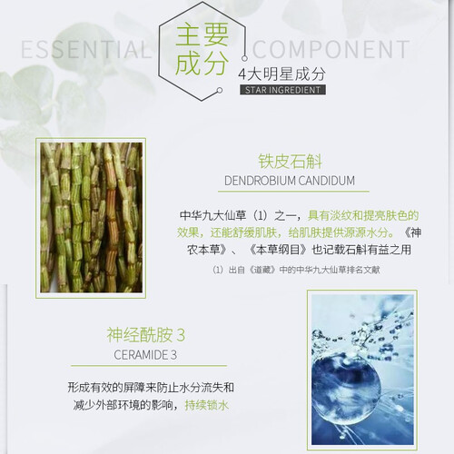 蕴含进口埃及茉莉花精油,使其具有淡雅的香气和深层渗透保湿的效果,搭配仙桃仙人掌茎提取物,牢牢锁住肌肤水分。