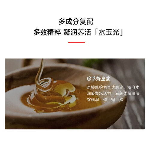 蕴含透明质酸成分,能够牢牢锁住,保持面部水润度。内含蜂王浆提取物,给予面部提供营养成分,减少干纹产生,令肌肤更有弹性。