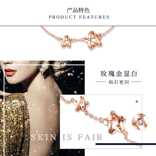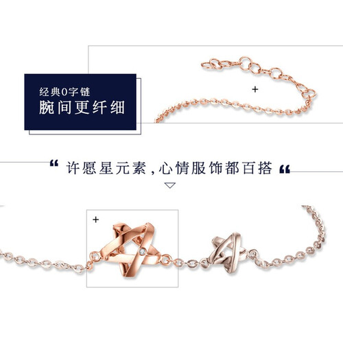 18k金打造,将许愿星星融入到手链中,仿若幸运一直环绕着你,心里所想皆可以实现。还点缀了闪闪的小钻石,增添时尚亮泽感。