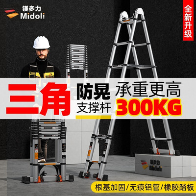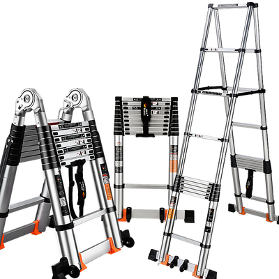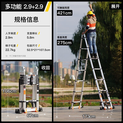 多功能折叠设计,人字梯约2.9米,展开当直梯使用可达5.8米,满足不同作业需求。底部三角加固设计,提高安全性。