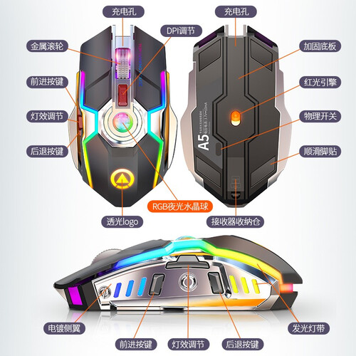 采用水晶炫彩流光,带来动感视觉体验;具备大容量可充电电池,方便您长时间使用;搭载独立接收器收纳,方便携带不怕丢失。