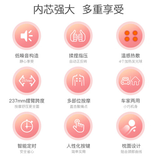 遵循人体工学设计,拥有45mm按摩深度,可以直击肌肉酸痛点,配合28度曲线摇摆,仿真人手法按摩,释放一天的疲惫。