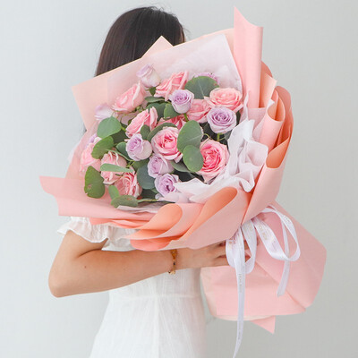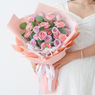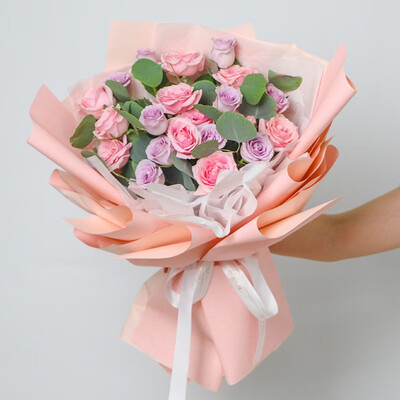 33朵混搭玫瑰花,香槟色和粉色清新靓丽,送出你的温情祝福;产于云南昆明鲜花基地,花材新鲜饱满盛开,香味持久不散。