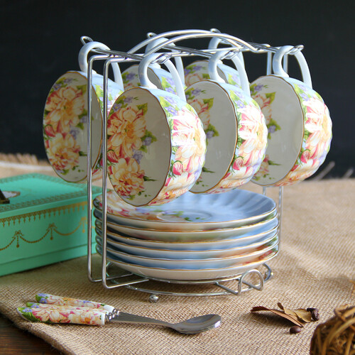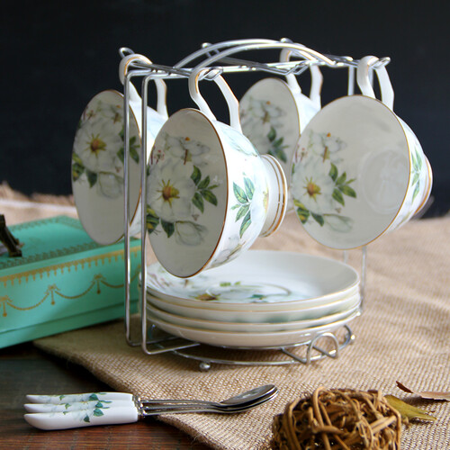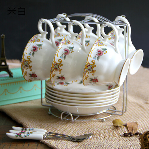 高档骨瓷复杂工艺,硬度高透光度好,瓷质通透润泽。欧式花边彩釉,典雅高贵,尽显宫廷风范。喇叭状稳固杯底,防滑耐磨。