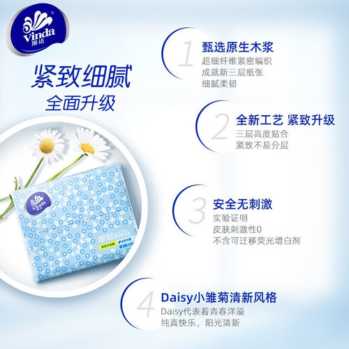 精选木浆,经过高温处理,洁净又卫生,纸质也是相当的柔韧,手感细腻不会留屑。主要由草浆制成,安全无刺激,柔韧不易破。