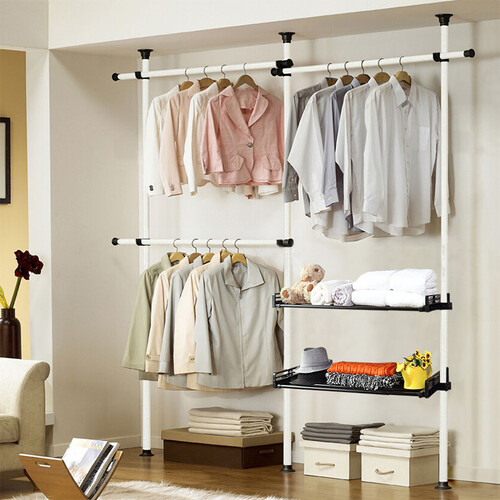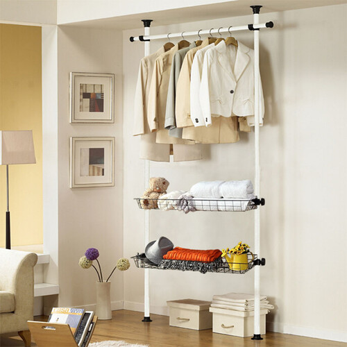 支架组装起来很方便,上下两层杆可以挂很多衣服。简洁好用不占地方,钢管粗而结实不掉漆耐磨,挂上衣物后很平稳。