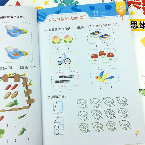 将生活中常见的事物、水果、蔬菜融入在数学训练中,吸引孩子的做题兴趣,锻炼宝宝观察力的同时提升算数能力。