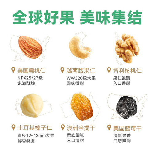六种科学配比的坚果、果干,营养更均衡,每日食用,为身体健康保驾护航。低温烘焙的制作,获取清脆的口感同时保证营养不流失。