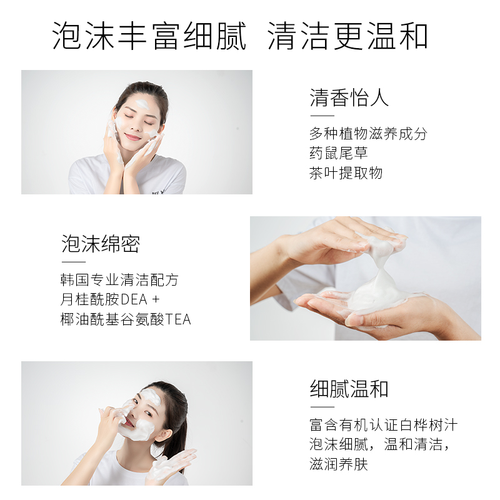 奶油泡沫加双重肌肤清洁因子,清洁不残留,温和不刺激。更有白桦树汁等多种植物成分滋养呵护肌肤。