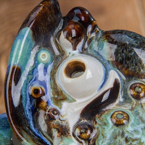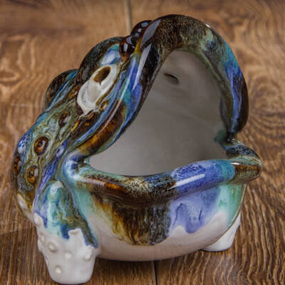 采用典故金蝉为原型,寄托了招财进宝的美好寓意。彩釉上色自然细腻,烧制中釉质流淌掺化,形成了美丽的纹理,更显生动。