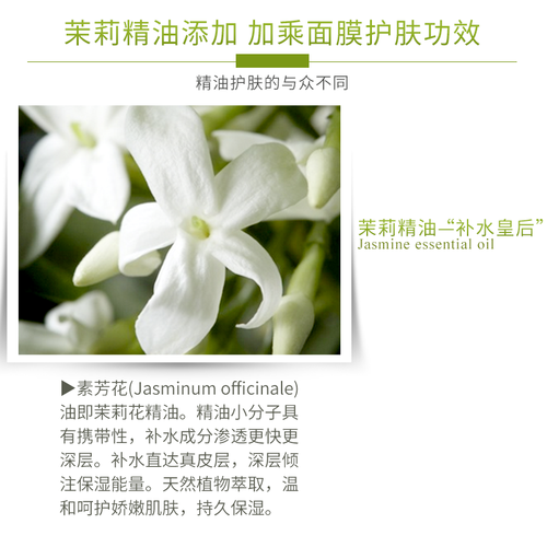 添加茉莉花精油和透明质酸成分,能为肌肤补充更多的水分,让肌肤水润透亮。搭配轻薄柔软的面膜纸,上脸更加舒适,吸收更快。