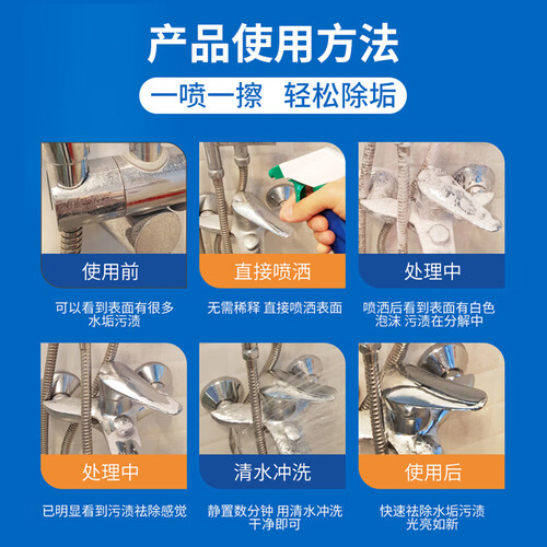源于欧洲进口的除垢剂,针对浴室水垢,快速清洁生活更健康;一喷即亮的质地,一分钟分解除垢,清水一冲还原透亮。
