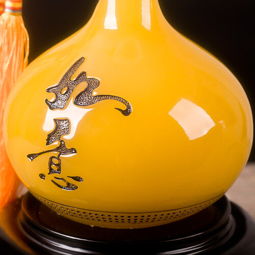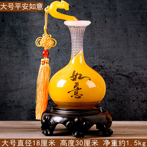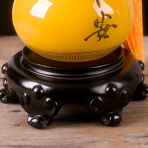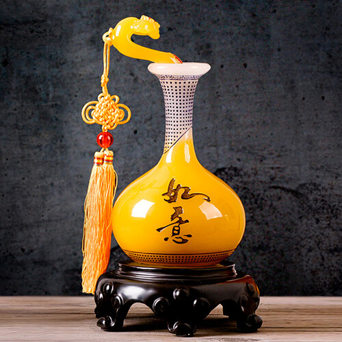 采用了传统的花瓶造型,瓶口的祥云图案搭配上伸出的如意,美观典雅,并且寓意美好。仿红木的底座设计,使古典气息更加浓郁。
