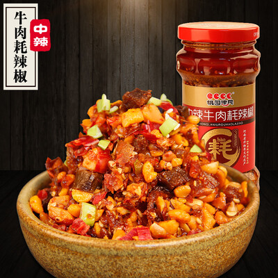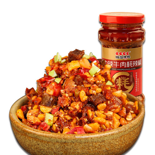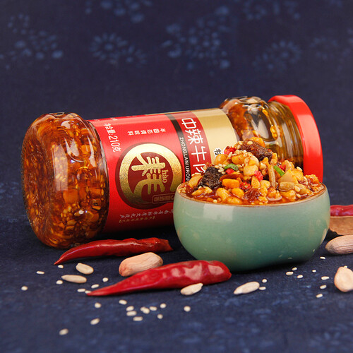 精选优质辣椒、新鲜牛肉、饱满花生等原料,结合独特的三耗九制技艺精心熬制而成,牛肉酱色泽油亮、辣而不燥,好吃不易上火。