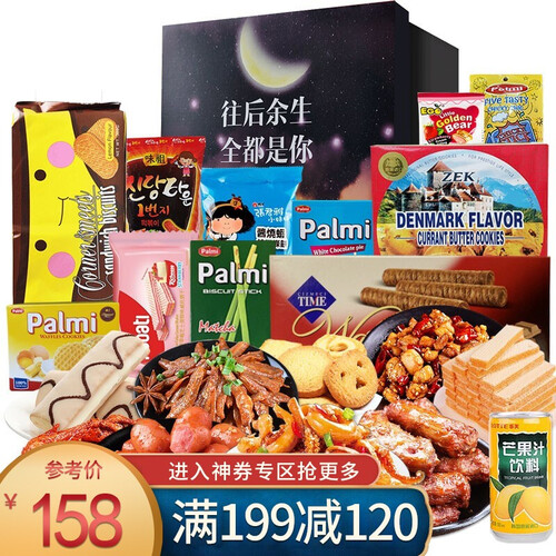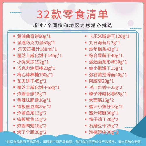 选自国内外32款小零食,每种都有当地特色,口味出众体验更美好。高颜值礼盒包装,上面带有精美图案和话语,送礼更显心意。