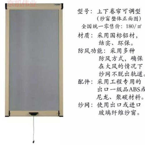 纱窗是上下卷帘式的,适用于各式平开窗,也可以装在推拉窗上。整体挂钩是全铝合金的,既方便使用而且很好操作。