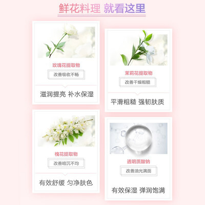 添加玫瑰花和茉莉花提取物,补水保湿,平滑粗糙肌肤,使肌肤细腻柔润。透明质酸钠成分,帮助改善面部油光,清爽不油腻。