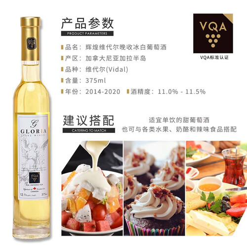 加拿大冰酒庄园原瓶原装进口,花香与热带水果的香气交织呼应,酸甜平衡的口感甜而不腻,可与水果、点心以及辣味食品搭配。