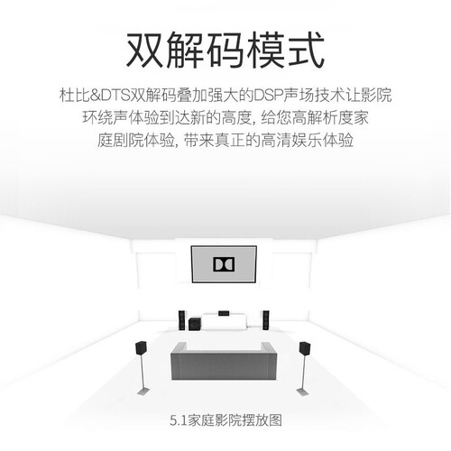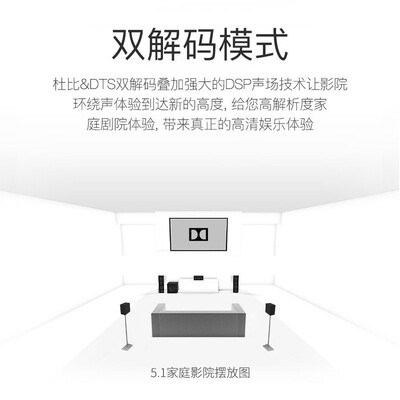 DTS&杜比双解码叠加强大的DSP声场技术让影院环绕声体验到达新的高度,给你高解析度家庭剧院体验,带来高清娱乐体验。