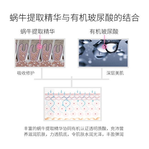 提取蜗牛精华,缓解肌肤敏感度,修复损伤肌肤。同时添加有机玻尿酸精华,深入基底由内而外深层补水,有效锁住肌肤水分。
