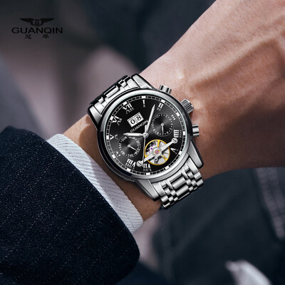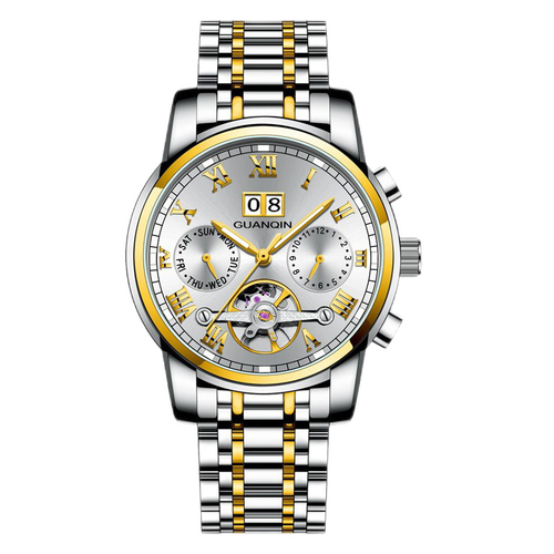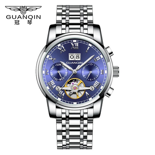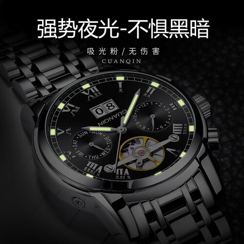 全自动机械机芯,上足发条可连续运转,强劲的走时和续航性能更稳定。不锈钢材质的表带,闪耀质感光泽。