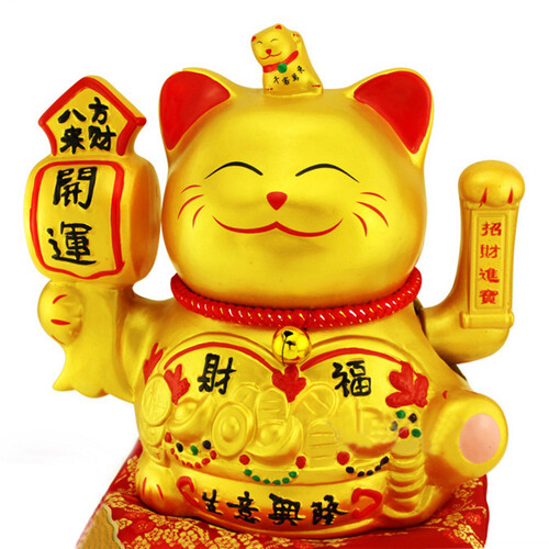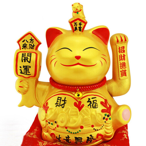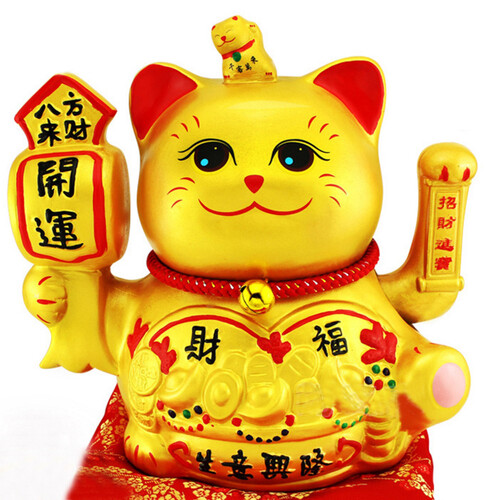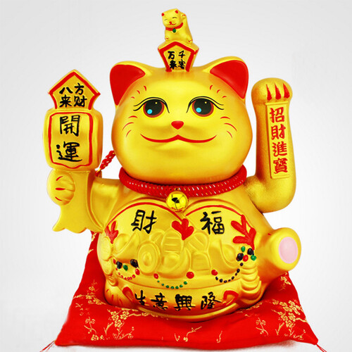 大号陶瓷材质招财猫,以高温工艺烧制而成,瓷质结实久用不易开裂。经典红金配色,配上八方来财的中文汉字,尽显吉祥喜庆质感。
