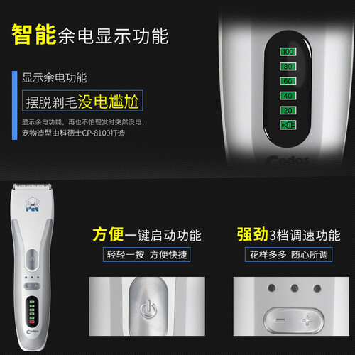 强劲马达,适合多种毛发类型的宠物,约5小时的超强续航能力,使用更方便。低震动低噪音设计,有效避免宠物抗拒心理。