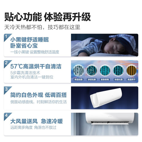 采用霜洗清洁技术,能够有效清洁内部灰尘,出风更洁净。低音运行的设计,可以减少空调运行的震动,静享舒适好眠。