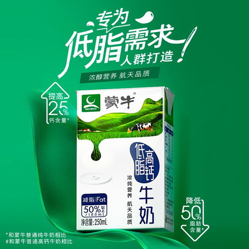 蒙牛低脂高钙牛奶,口感润滑奶香浓醇,低脂肪高蛋白助力肠道好吸收。航天品质的高钙牛奶,来自集约化牧场,滴滴醇正。