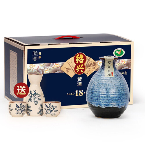 内置陶瓷分酒器和酒杯,精美三件套外观古朴大气,自带酒文化魅力。绍兴黄酒原产地认证,经过十八年陈酿而成,酒味鲜爽醇和。