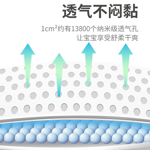 一体式复合吸收芯体,尿湿后不易出现断层现象,持久干爽舒适。上万个纳米透气孔,成就清爽体验,潮气迅速散发,拒绝闷热。