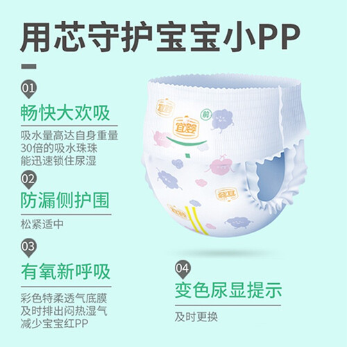 采用高分子复合吸收芯体,快速吸收尿液,不易反渗,吸水量高达自身重量30倍,温柔呵护宝宝小屁屁。