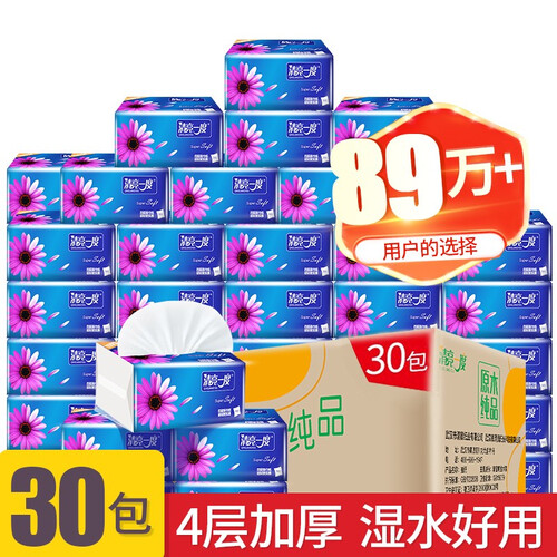 原生木浆纤维四层加厚设计,湿水韧性好不易破,柔软的纸张呵护娇嫩肌肤,可以干湿两用不掉尘屑,使用倍感安心。