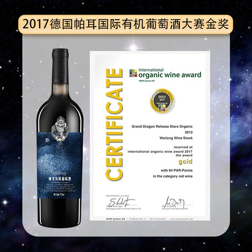 有机培育美乐葡萄,原料饱满新鲜,果香浓郁,适宜酿酒。酒体醇厚圆润,带有鲜明的浆果风味和香草气息。