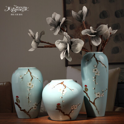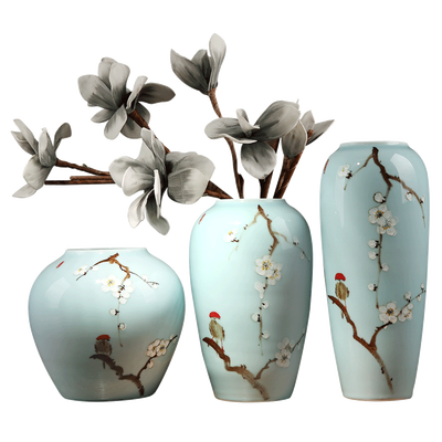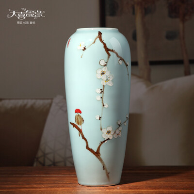 手工制作的陶瓷花瓶,瓷面加以梅花、鸟雀图案点缀,给人素净雅致的视觉美感,居家插花摆放倍显高雅生活格调。