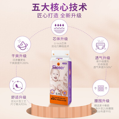 应用双动力瞬吸技术,瞬吸尿液的同时可牢牢锁住水分,干爽不回渗。360°环抱透气腰围设计,贴肤舒适无勒感。