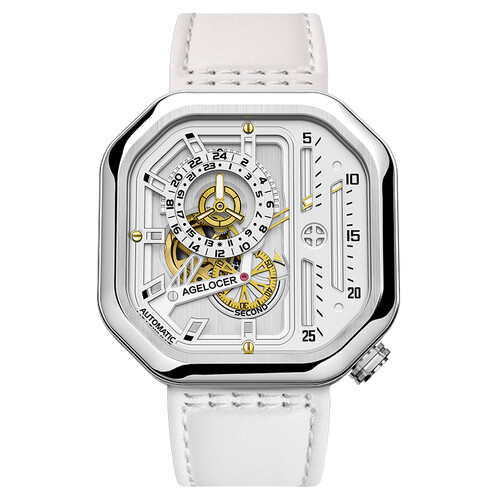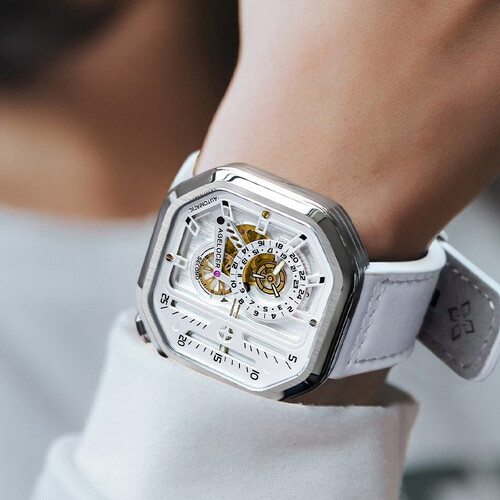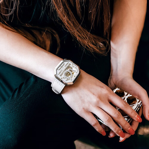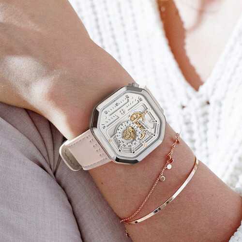 多重表盘层层叠加,形成了一个立体小空间,镂空机械的设计,能够清楚看到机械的每一个细节。
