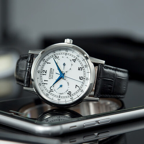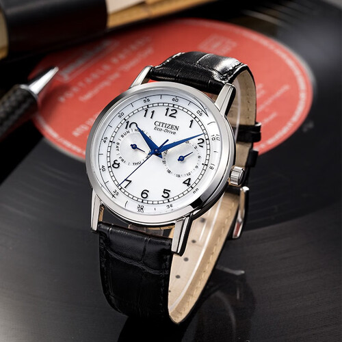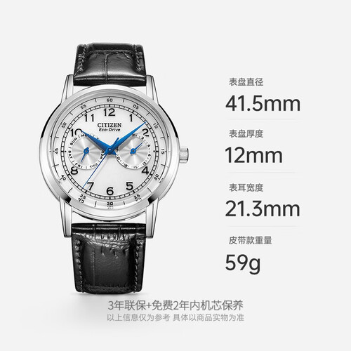 双历显示,两个小表盘,分别显示星期、日期,佩戴更便捷。表内配备光动能机芯,利用任何可见光源为手表运转提供动力,时尚环保。