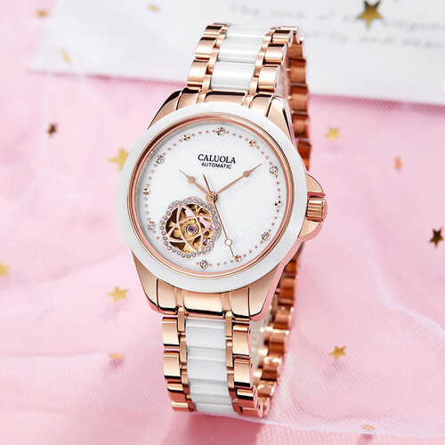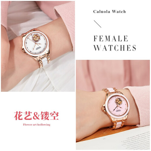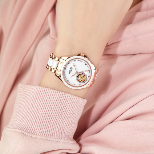 镂空花朵的工艺,可以呈现优雅的机械美态。白色的表盘,融入金色的镂空造型,显得十分典雅别致。搪瓷字面,简洁平整,读时清晰。